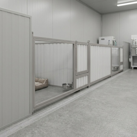 Façade de niche pour chiot 150 x 100 cm avec porte intégrée. Panneau sandwich de 30 mm offrant une isolation thermique et acoustique optimale et une hygiène maximale. Idéal pour un hébergement sûr et confortable.