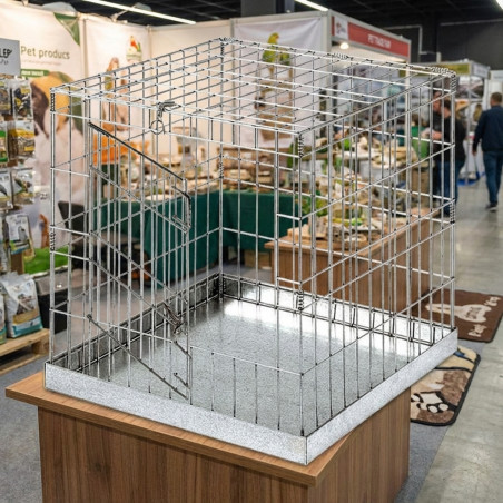Cage d'exposition avec porte. Alternative rapide, polyvalente et fonctionnelle pour les expositions d'animaux de compagnie dans les foires et animaleries. Plateau inférieur en tôle galvanisée qui évite la saleté. Mesures 60x60 cm.