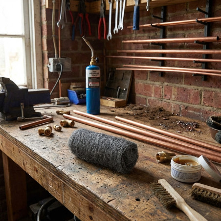 On utilise de la laine d'acier pour nettoyer les tuyaux et raccords en cuivre avant le processus de soudure.