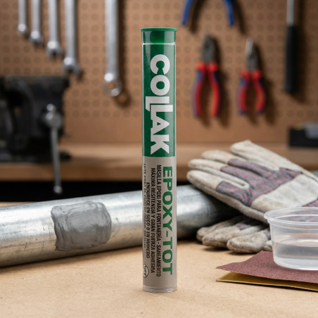 Mastic époxy bi-composant à prise ultra-rapide (environ 3 minutes). Résistance maximale et forte adhérence. Durcit à sec ou humide. Convient au contact avec l'eau potable. Facile à mélanger et à appliquer à la main. Pour les réparations d'urgence ou permanentes de tuyaux en métal ou PVC, de réservoirs d'eau, de fuites au niveau des raccords, vannes et pièces de connexion. Convient également pour la réparation de carrelage, céramique, briques, etc. Pour la fixation de boulons, vis, clous, tiges, etc. Non recommandé pour une utilisation sur polyéthylène ou polypropylène. Les surfaces à réparer doivent être exemptes de poussière, d'huile ou de graisse. Prélevez la quantité de mastic souhaitée et malaxez-la entre vos doigts jusqu'à obtenir une couleur grise uniforme. Appliquez le mastic sur la zone à réparer dans les deux minutes suivant le mélange. Pressez le mastic dans les fissures, rainures ou trous à colmater. Pour une meilleure adhérence, et si possible, il est recommandé de poncer la surface à réparer au préalable. Pour une finition uniforme, frottez avec un chiffon humide ou les doigts humidifiés. La pâte a une texture légèrement collante, mais elle ne doit pas adhérer excessivement aux doigts. Pour minimiser l'adhérence, il est recommandé de se saupoudrer les mains de talc ou d'une poudre similaire avant de la malaxer. Retirez tout excédent de pâte avant qu'elle ne durcisse. Nettoyez avec un solvant. Une fois durcie, la pâte forme une liaison extrêmement forte et ne peut être retirée que mécaniquement.