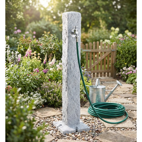 Fontaine de jardin effet granit clair, imitation pierre . Idéale pour le puisage d'eau dans le jardin. Comprend un robinet ¾". Fabriquée en polyéthylène résistant aux intempéries. Raccordement inférieur 19 mm (3/4"), vanne sur le support pour le raccordement à une pompe ou à l'arrivée d'eau courante. Hauteur : 1 mètre. Base : 13 x 13 cm.