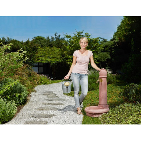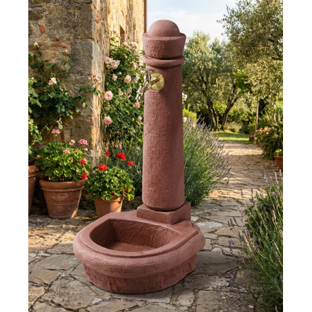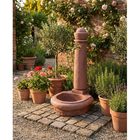 La fontaine de jardin Venezia en pierre rougeâtre imite à la perfection la pierre naturelle. Elle est équipée d'un robinet antique de 19 mm (3/4") pour une distribution d'eau aisée et d'un raccord inférieur pour un tuyau d'arrosage de même diamètre. Mesurant 90 cm de haut, 44 cm de large et 52 cm de profondeur, cette fontaine pèse 7 kg.