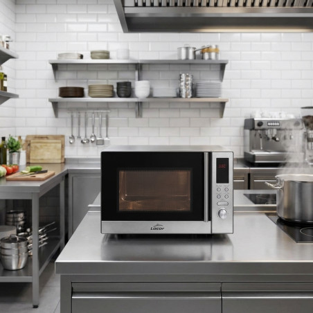 Four à micro-ondes professionnel avec plateau tournant, argenté, capacité de 25 litres, 900 W. Fabriqué en acier inoxydable de haute qualité, ce four à micro-ondes est doté de commandes électroniques modernes permettant de régler différents paramètres de cuisson : puissance, durée, grill, décongélation, démarrage rapide et minuterie. Il permet également la cuisson multi-sections et comprend un plateau tournant de 27 cm et une grille intégrée.