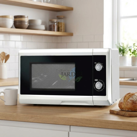 Four 2 en 1. Pratique et compact, ce four avec fonction micro-ondes est idéal pour toutes les cuisines. D'une capacité de 20 litres et d'une puissance de 700 W, il propose 5 niveaux de puissance pour s'adapter à vos besoins, ainsi qu'une fonction décongélation. Il est équipé d'une minuterie analogique de 30 minutes avec signal sonore. Son ouverture manuelle de la porte facilite son utilisation. Enfin, ses pieds antidérapants assurent une parfaite stabilité.