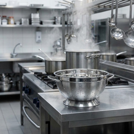 Fabriquée en acier inoxydable de haute qualité , cette passoire offre une résistance exceptionnelle à la corrosion, aux acides alimentaires et aux hautes températures, garantissant une longue durée de vie même dans les environnements de travail les plus exigeants. Sa surface lisse et non poreuse facilite un nettoyage rapide et complet, un atout essentiel dans les cuisines professionnelles où l'hygiène est primordiale. De plus, sa conception robuste et professionnelle la rend idéale pour un usage intensif et continu.