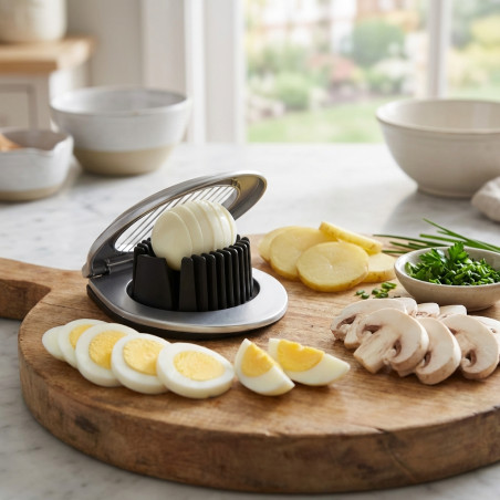 Ce coupe-œufs multifonction est fabriqué en plastique ABS et possède des lames en acier qui facilitent la découpe et vous font gagner du temps lors de la préparation de vos plats. Vous pouvez couper des œufs, des pommes de terre cuites ou des champignons en triangles ou les trancher sans effort et en un temps record. Dimensions : 10 x 7 x 10 cm.