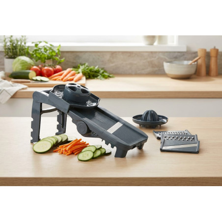 Mandoline robuste et fonctionnelle (sans BPA). Base en silicone antidérapante et pliable. Protection pour les doigts afin d'éviter tout contact avec les lames pendant l'utilisation. Comprend 5 lames et un accessoire pour extraire le jus. Lames facilement amovibles pour le lavage. Dimensions : 15 x 35 x 10 cm.