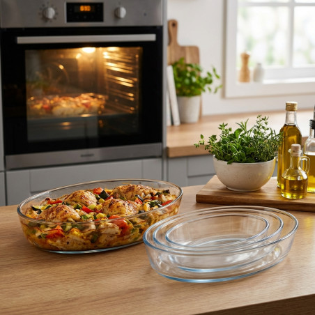 Ensemble de 3 plateaux ovales en verre borosilicate, compatibles four, micro-ondes et congélateur. Capacités : 0,7 L, 1,6 L et 2.4L. Polyvalents, sûrs et faciles à nettoyer.