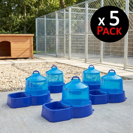 Pack de 5 abreuvoirs pour chiens d'une capacité de 5 litres. Fabriqué en plastique résistant. Dimensions : 35x25x25 cm. L' abreuvoir pour chien avec bouteille dans sa nouvelle version améliorée permet un approvisionnement en eau propre et fraîche en permanence et avec une grande autonomie dans ses trois tailles de 12, 8 et 5 litres, permettant de l'utiliser quelle que soit la race ou la taille de votre chien. Vous pouvez avoir suffisamment d’eau sans avoir besoin de la verser constamment. Mangeoire de haute qualité fabriquée en Espagne.