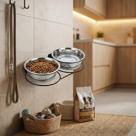 Cette mangeoire pour chien pratique avec double support pour fonctionner comme mangeoire-abreuvoir a une capacité de 2,8 litres dans chaque gamelle. Son support est très stable puisqu'il se fixe directement au mur et son installation est très simple. Capacité 2,80 litres x 2. Mesures. Ø25 cm x 2. 51 x 26 x 8,2 cm. Également utilisé comme abreuvoir pour les animaux. Mangeoire de haute qualité fabriquée en Espagne.