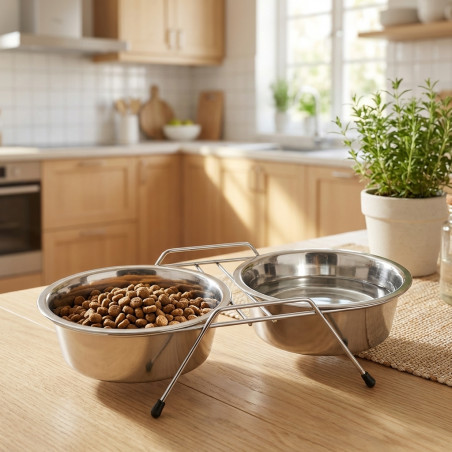 Mangeoire pour chien avec deux plaques doubles en acier inoxydable, à utiliser comme mangeoire et abreuvoir ou comme deux mangeoires ou deux abreuvoirs. Solution pratique et confortable car elle permet d'en avoir 2 en 1. Également utilisé comme abreuvoir pour les animaux. Capacité. Ø16,5 cm par assiette. 0,75 litre x 2. Dimensions 35 x 17 x 7 cm. Mangeoire de haute qualité fabriquée en Espagne.