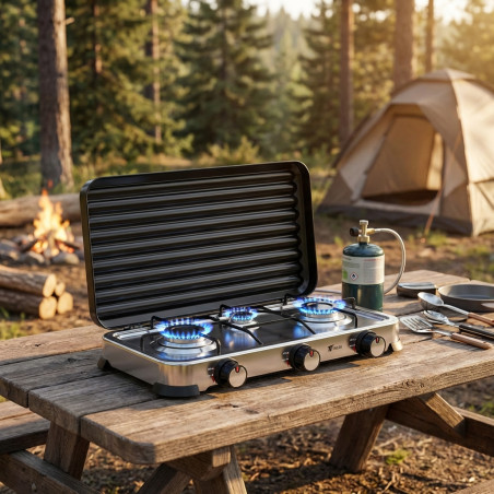 Réchaud à gaz portable avec 3 brûleurs puissants et couvercle intégré. Corps robuste en acier inoxydable, allumage piézo sécurisé et utilisation facile avec butane ou propane. Idéal pour le camping et la cuisine en plein air.
