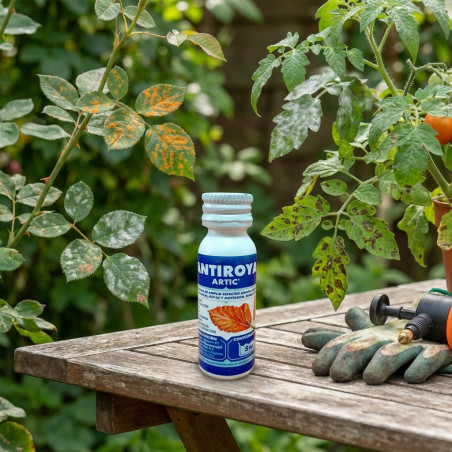 Fongicide de contact, systémique et translaminaire , à action préventive, curative et éradicatrice. Approuvé pour le jardinage extérieur domestique. Utilisations contre la rouille, l'alternariose, la moniliose, les taches foliaires, la sclérodermie et la marbrure. Appartenant au groupe des triazoles, il possède une action préventive et curative. Il prévient la croissance fongique et stoppe l'infection pendant la période d'incubation (action curative). Il pénètre rapidement dans la plante, affichant un mouvement translaminaire et une activité systémique locale. Dosage : 0,5 ml par litre d'eau. Il s'utilise pendant la phase de croissance des plantes jusqu'à l'apparition des premières fleurs.