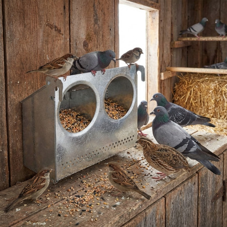 Mangeoire double idéale pour les pigeons , oiseaux et autres oiseaux, facile à plier. Fabriqué en tôle. Mesures 13x7,5x10 cm.