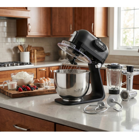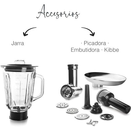 Le robot pâtissier-mélangeur Delicy est un appareil très polyvalent. Compatible avec les accessoires hachoir à viande et saucisses, ainsi qu'avec le bol mélangeur en verre, il est doté d'un bouton à deux vitesses (lente/rapide) grâce à un mécanisme à roulement à billes à deux vitesses, permettant la préparation rapide et efficace de différents types de saucisses, comme le chorizo, les saucisses classiques et les saucisses catalanes. Le panneau de commande manuel est très intuitif, avec un écran, une minuterie et un sélecteur de vitesse. Stable et sûr : ses pieds à ventouses antidérapants assurent une stabilité maximale. La tige de mélange et le pétrisseur sont en aluminium avec revêtement antiadhésif, et le fouet est en acier inoxydable. Tous ces accessoires sont facilement interchangeables et lavables. Dimensions : 32,5 x 25 x 36,5 cm. Poids : 6,35 kg. Puissance : 1 000 W. Vitesse : 13 500 rpm . Capacité : 5 L. Tension : 220-240 V ; 50/60 Hz.
