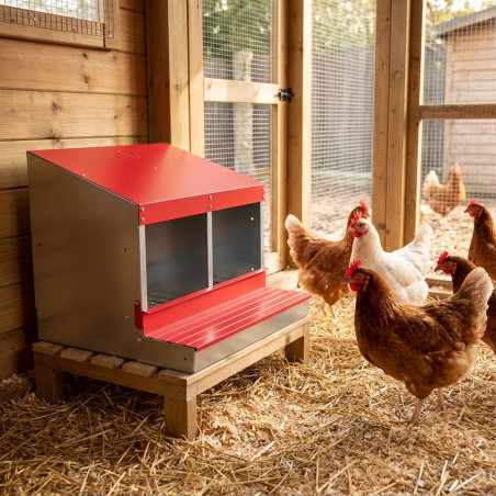 Chaque département de nidification suffit pour 6 poules. Permet aux poules de pondre dans un endroit intime et confortable. Nichoir en tôle galvanisée avec revêtement effet bois, résistant à la corrosion. Maille électrosoudée à l'intérieur qui empêche la saleté. Base en thermoplastique haute résistance. Le nid dispose d'une réserve d'œufs d'une capacité allant jusqu'à 6 œufs, ce qui empêche la poule de les picorer. Il peut être facilement retiré pour le nettoyage et la désinfection. Mesures 53x50x44 cm.