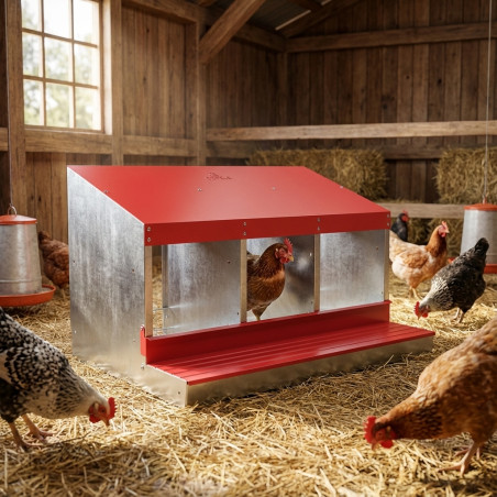Chaque département de nidification est suffisant pour 6 poules . Permet aux poules de pondre dans un endroit intime et confortable. Nichoir en tôle galvanisée avec revêtement effet bois, résistant à la corrosion. Maille électrosoudée à l'intérieur qui empêche la saleté. Base en thermoplastique haute résistance. Le nid dispose d'une réserve d'œufs d'une capacité allant jusqu'à 6 œufs, ce qui empêche la poule de les picorer. Il peut être facilement retiré pour le nettoyage et la désinfection. Mesures 80x50x44 cm.