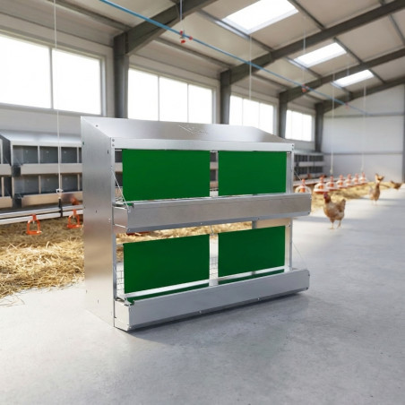 Nichoir collectif pour poules , en tôle galvanisée de haute qualité, d'une capacité de 100 poules. Nid collectif pour élevage de volailles semi-industriel, avec possibilité de placer un tapis en polyéthylène qui facilite le nettoyage du nid. De plus, une ceinture automatique peut être ajoutée, car il est possible qu'ils puissent être réunis en un seul module en pouvant aligner les réservoirs nids en retirant les embouts. Dimensions 118x50x97 cm Pieds, support en tôle et tapis en polyéthylène non inclus.