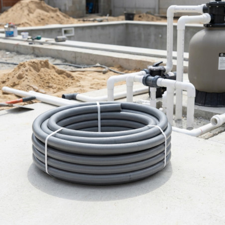 Tuyau flexible en PVC gris certifié AENOR. Ce tuyau hydrofuge offre flexibilité, légèreté et robustesse. Fabriqué en PVC avec une âme rigide en PVC. Disponible en diamètres de 20 à 50 mm (D20 à D50), en rouleaux de 25 mètres. Les diamètres extérieurs sont optimisés pour un assemblage facile avec des raccords en PVC et PE. Convient à une large gamme d'applications d'aspiration et de refoulement : plomberie, systèmes de filtration de piscines, bains à remous, drainage, évacuation des condensats, systèmes de climatisation, etc.