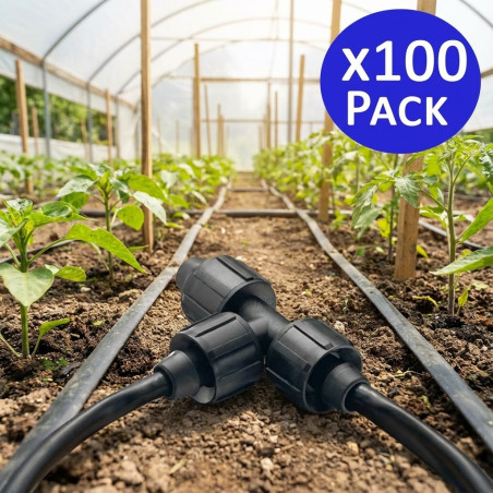 Te pour ruban d'irrigation goutte à goutte 16 mm. Mesure 16mm. Vous devez connecter trois bandes d'irrigation. Accessoire d'irrigation goutte à goutte fabriqué en Italie, de la plus haute qualité. Emballer 100 unités.