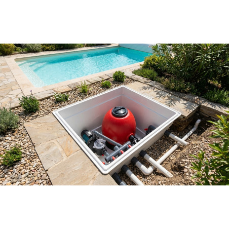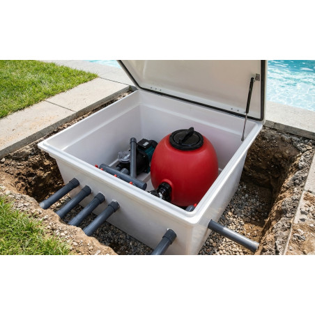 Le caisson de filtration enterré avec filtre STAR PLUS - 500, vanne latérale et pompe IRI 1000 M est une solution haut de gamme pour votre piscine. Il comprend un filtre avec vanne de sélection à 6 positions, une pompe monophasée avec préfiltre, un collecteur, les accessoires et des vannes PVC Ø 50 mm : tout le nécessaire pour un système de filtration performant. Sa coque en polyester et fibre de verre garantit robustesse et durabilité, tandis que la pompe de 1 CV assure un débit de 11 m³/ha à une pression de 10 ma