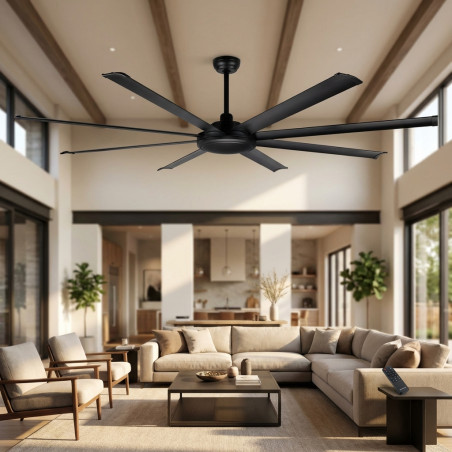 Ventilateur de plafond silencieux avec moteur DC – Ce ventilateur de plafond est équipé d'un moteur DC à faible consommation, ce qui permet non seulement de réduire le bruit, mais aussi la consommation énergétique, garantissant ainsi un fonctionnement efficace et silencieux pour un environnement plus confortable. Puissance : 100W. Connexion : 230 V ~ 50 Hz. 8 pales de grande taille pour une meilleure circulation de l'air – Avec un diamètre de 300 cm et 8 pales de grande taille, ce ventilateur assure une circulation d'air plus puissante et uniforme, idéal pour les grands espaces comme les salons ou les chambres spacieuses. 6 vitesses réglables et système réversible – Il propose 6 niveaux de vitesse pour ajuster le flux d'air en fonction de vos besoins. De plus, son système de ventilation réversible permet de changer le sens de rotation du ventilateur, apportant de l'air frais en été et aidant à distribuer la chaleur en hiver. Télécommande et minuterie programmable – Contrôlez facilement les fonctions du ventilateur avec la télécommande incluse. Il dispose également d'un minuteur programmable qui permet de l'éteindre automatiquement après 1, 2, 4 ou 8 heures, ce qui le rend plus pratique et efficace. Design moderne et polyvalent – Avec une hauteur de 35 cm en utilisant la tige courte ou 47,5 cm avec la tige longue, ce ventilateur s'adapte à différents types de plafonds.