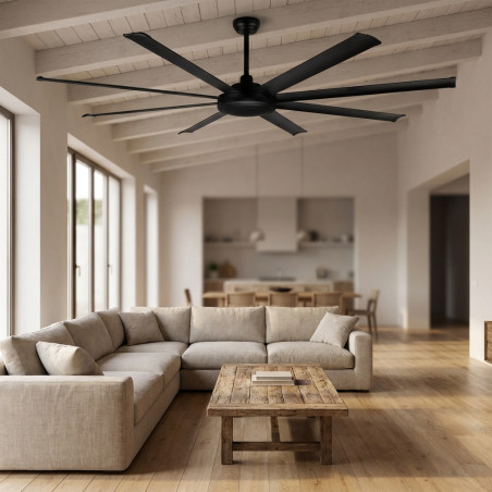 Ventilateur de plafond Orbegozo 6 vitesses | 8 pales de diamètre 300 cm | Télécommande | Système de ventilation réversible Caractéristiques du produit: Ventilateur de plafond silencieux avec moteur DC : Ce ventilateur est équipé d'un moteur DC à faible consommation, réduisant ainsi le bruit et la consommation énergétique, pour un fonctionnement efficace et silencieux, offrant un environnement confortable. Puissance : 100W. Connexion : 230 V ~ 50 Hz. 8 pales de grande taille pour une meilleure circulation de l'air : Avec un diamètre de 300 cm et 8 pales, ce ventilateur assure une circulation de l'air plus puissante et uniforme, idéal pour les grandes pièces comme les salons ou les chambres spacieuses. 6 vitesses réglables et système réversible : Il propose 6 niveaux de vitesse pour ajuster le flux d'air selon vos besoins. De plus, son système de ventilation réversible permet de changer la direction des pales, offrant un air frais en été et aidant à répartir la chaleur en hiver. Télécommande et minuterie programmable : Contrôlez facilement toutes les fonctions du ventilateur grâce à la télécommande incluse. Il dispose également d'une minuterie programmable pour s'éteindre automatiquement après 1, 2, 4 ou 8 heures, le rendant plus pratique et efficace. Design moderne et polyvalent : Avec une hauteur de 35 cm avec la tige courte ou 47,5 cm avec la tige longue, ce ventilateur s'adapte à différents types de plafond. Questions fréquentes : Comment fonctionne le système réversible du ventilateur de plafond ? Le système réversible permet de changer la direction des pales. En été, le ventilateur tourne dans le sens antihoraire pour créer une brise fraîche, et en hiver, il tourne dans le sens horaire pour répartir uniformément l'air chaud. Le ventilateur de plafond consomme-t-il beaucoup d'énergie ? Non, ce ventilateur dispose d'un moteur DC à faible consommation, réduisant ainsi considérablement la consommation d'énergie et étant plus efficace que les ventilateurs traditionnels. Quelle taille de pièce convient à un ventilateur de plafond de 200 cm ? Ce ventilateur de 300 cm est idéal pour des pièces spacieuses comme les salons, les salles à manger ou les chambres de jusqu'à 30 m², assurant une circulation d'air puissante et uniforme. Le ventilateur de plafond est-il facile à installer ? Oui, l'installation du ventilateur est simple et peut être réalisée sur des plafonds de différentes hauteurs, avec les tiges courtes ou longues fournies dans le paquet. Une installation professionnelle est recommandée pour assurer son fonctionnement optimal. Puis-je contrôler le ventilateur sans avoir à me lever du canapé ou du lit ? Oui, ce ventilateur comprend une télécommande vous permettant d'ajuster la vitesse, la direction des pales et de programmer la minuterie sans avoir besoin de vous lever. Idéal pour un confort supplémentaire.