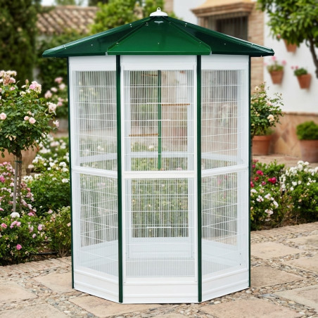 Volière de haute qualité pour perroquets et oiseaux. Format 8 faces d'une dimension totale 150 x 235 cm. Toit vert. Fabriqué en Espagne.