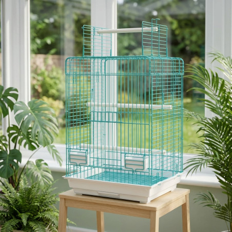 Cage perroquet amovible. Equipé de mangeoires, abreuvoirs et bâtons. Plateau inférieur amovible. Mesures 50x39x78 cm.