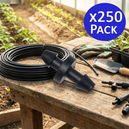 Collegamento microtubo dritto da 4,5 mm. Accessorio utilizzato nell'irrigazione a goccia. Utilizzato per unire microtubi da 4,5 x 6,5 mm. Colore nero. Alta qualità. Fornito in un sacchetto da 250 unità.