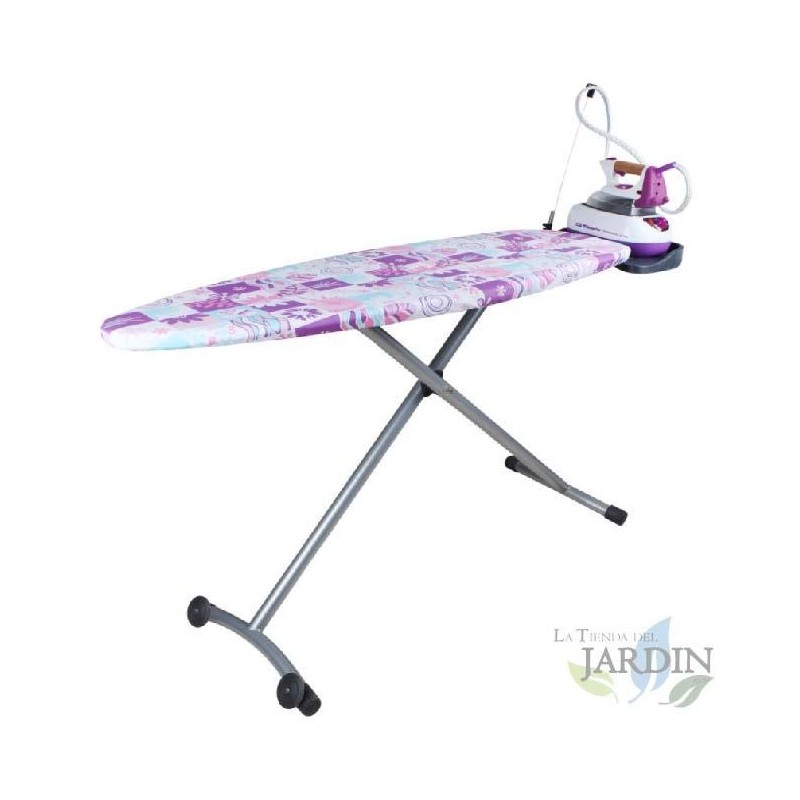 Tavolo da stiro Orbegozo realizzato in rete di acciaio, con altezza regolabile fino a 93 cm e dimensioni di 135x46 cm. Include rivestimento in cotone 100%, poggiaferro pieghevole e ruote per un facile trasporto.