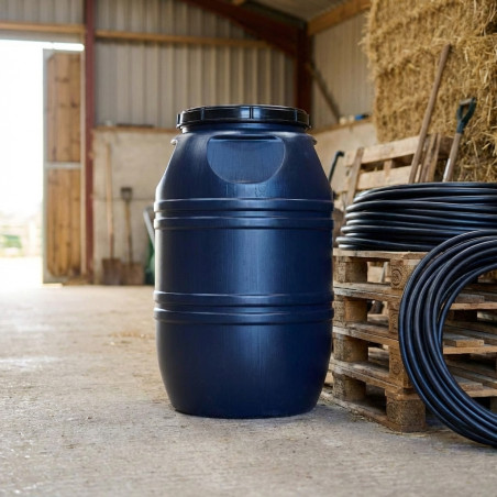 Robusto fusto in plastica da 220 litri (100x60x60 cm), ideale per lo stoccaggio sicuro ed efficiente di acqua e vari liquidi. Realizzato in plastica ad alta resistenza, combina grande capacità e durata per uso industriale, agricolo o domestico.