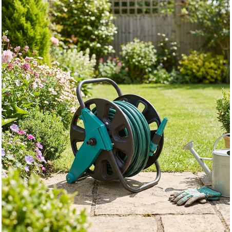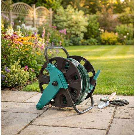 Carrello portagomma che include un tubo per l'irrigazione da 15 metri. Con raccordi e lancia per irrigazione. Risparmia spazio con questo carrello per tubi di alta qualità.