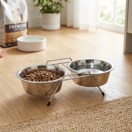 Mangiatoia per cani con due piastre doppie in acciaio inox, da utilizzare come mangiatoia e abbeveratoio oppure come due mangiatoie o due abbeveratoi. Soluzione pratica e comoda poiché permette di averne 2 in 1. Utilizzabile anche come abbeveratoio per animali. Capacità. Ø25 cm per piatto. 2,80 litri x 2. Misure 52 x 26,5 x 10 cm. Mangiatoia di alta qualità prodotta in Spagna.