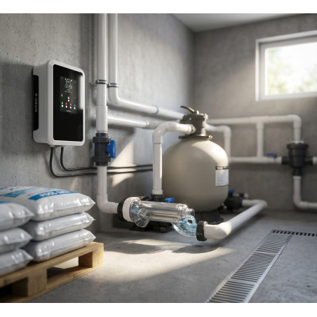Con una capacità di produzione di 12 grammi di cloro all'ora (12 g/h), questo cloratore garantisce un trattamento ottimale anche in caso di utilizzo intensivo. Si integra facilmente nel vostro sistema di filtrazione e il suo funzionamento è silenzioso e ad alta efficienza energetica, con conseguenti risparmi significativi a lungo termine.
