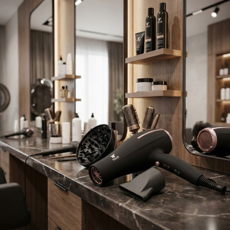Asciugacapelli THULOS con motore DC da 2000 W, 2 velocità e 3 impostazioni di temperatura. Dotato di effetto soft-touch, pulsante getto d'aria fredda, diffusore e concentratore inclusi e filtro rimovibile per una facile pulizia.