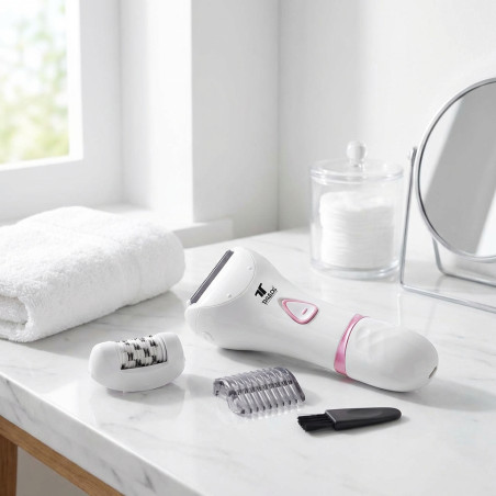 Rasoio femminile Thulos con testina epilatrice rimovibile, ideale per una depilazione precisa e confortevole. Inoltre, include un pettine guida taglio per diverse lunghezze di capelli, che funziona ad una velocità di 6500-7500 giri/min. Ha un interruttore ON/OFF per un facile utilizzo e utilizza 2 batterie AAA (non incluse) per il funzionamento. Viene fornito anche con una spazzola per la pulizia per mantenere il rasoio in perfette condizioni.