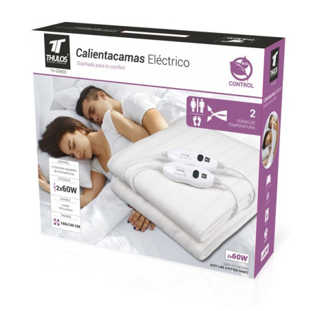 Coperta elettrica ideale per porre fine al freddo a letto. Dimensioni: 160x140 cm. Materiale: 100% poliestere bianco. 2 controller rimovibili. 2 impostazioni di calore. Indicatore luminoso a LED. Protezione contro il surriscaldamento. Lavabile in lavatrice. Potenza: 2x60 W. Voltaggio: 220-240 V ~ 50 Hz.