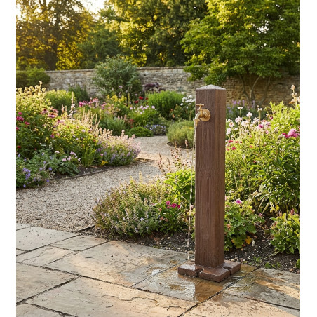Fontana effetto legno . Fonte d'acqua per il giardino . Include un rubinetto da ¾". Realizzata in polietilene resistente alle intemperie. Attacco inferiore da 19 mm (3/4"), valvola sul supporto per il collegamento a una pompa o alla rete idrica. Altezza 1 metro. Larghezza e altezza 13 cm.