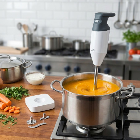 Potente frullatore a immersione professionale con lama in acciaio inox e design anti-schizzo. Perfetto per tritare, mescolare ed emulsionare in pochi secondi, direttamente nella pentola. Massima efficienza e pulizia in cucina.