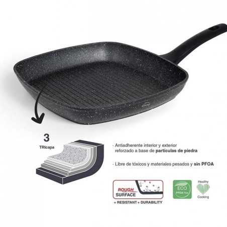 Teglia con strisce, grill. Realizzato in alluminio forgiato di altissima qualità. Rivestimento antiaderente TRI layer rinforzato con particelle a base pietra, esente da materiali tossici e pesanti. Ecologico e privo di PFOA. Risparmio energetico, fino al 45% più efficiente, grazie alla base diffusore FULL INDUCTION. La base in alluminio consente una distribuzione uniforme del calore, consentendo una cottura rapida e uniforme degli alimenti, senza l'utilizzo di olio. Massima resistenza all'usura. Facile pulizia interna ed esterna grazie alla sua protezione antiaderente. Compatibilità: tutti i tipi di piani cottura, compresa l'induzione. Misure: 28 x 28 cm. 2 anni di garanzia.