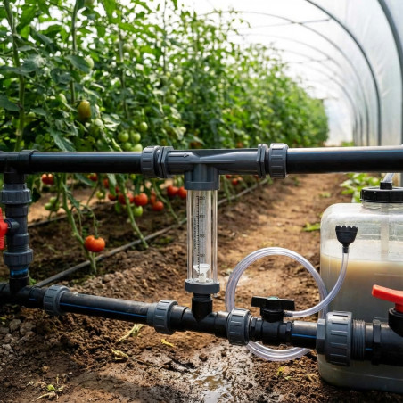 L'iniettore di fertilizzante Venturi include un flussometro per misurare con precisione la quantità di fertilizzante introdotto.