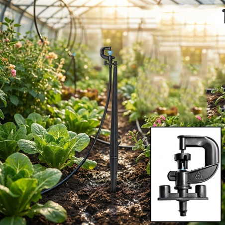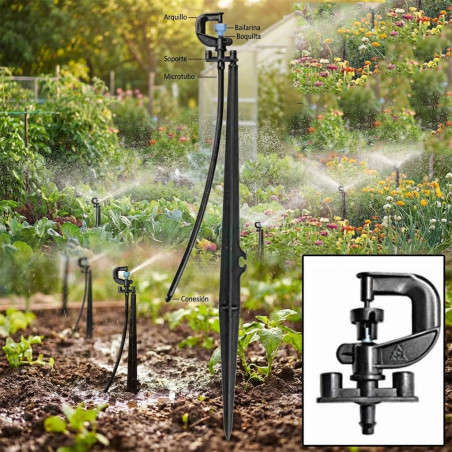 Ballerina per irrigazione con angolo di rotazione di 360º. Portata da 73 a 125 l/h. Raggio di portata 3 metri. Prodotto in Spagna con materiali plastici di alta qualità. Include picchetto di collegamento da 40 cm. Confezione da 100 unità. Consultare il prezzo per grandi quantità.