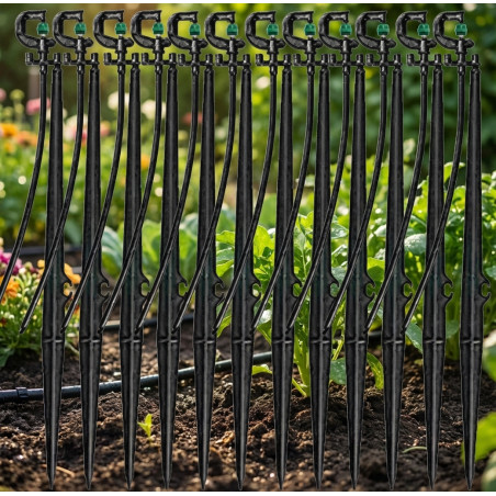 Sistema di microirrigazione a goccia con microirrigatore ad angolo fisso di 360º e picchetto da 40 cm per una portata di 2,5-3 m. Ideale per l'irrigazione di giardini e frutteti.