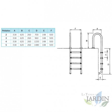 Scala modello Muro con corrimano, per piscine interrate, realizzata in tubo di acciaio inox Ø43mm con finitura lucida lucida. Gradini in acciaio inox. La sua progettazione attenta garantisce sicurezza contro ogni tipo di scivolamento o taglio. Fornito con tasselli di fissaggio, predisposti per il collegamento alla presa equipotenziale. Modello standard: corrimano e gradini in acciaio inossidabile AISI-304. Disponibile con gradini Standard a 2, 3, 4 o 5 gradini