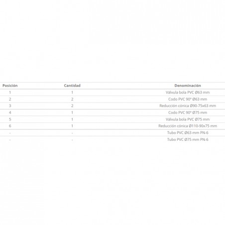 Valvola a sfera in PVC Ø63 mm - Gomito in PVC 90º Ø63 mm - Riduzione conica Ø90-75x63 mm - Gomito in PVC 90º Ø75 mm - Valvola a sfera in PVC Ø75 mm - Riduzione conica Ø110-90x75 mm - Tubo in PVC Ø63 mm PN-6 - Tubo in PVC Ø75 mm PN-6