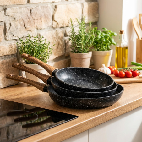 Le padelle del set hanno rispettivamente un diametro di Ø20 cm, Ø24 cm e Ø28 cm.