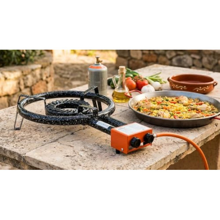 Fornello Paellero a gas butano Lacor da 30 cm, ideale per padelle da 36 a 46 cm. Questa stufa è valida per propano e butano, ma non è compatibile con gas naturale o gas di città.