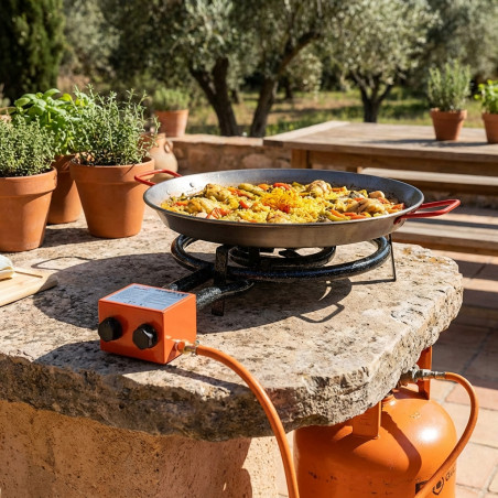 Questo fornello per paella LACOR è ideale per cucinare deliziose paella all'aperto. Compatibile con gas propano e butano, questo fornello offre una grande versatilità per preparare paella di diverse dimensioni, poiché si adatta a padelle da 38 a 70 cm. Progettato specificamente per il supporto per paella LACOR rif. 63700, questo fornello garantisce una cottura uniforme ed efficiente.