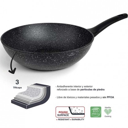 Wok in alluminio forgiato di alta qualità. Rivestimento antiaderente rinforzato a tre strati con particelle di pietra, privo di metalli tossici e pesanti.